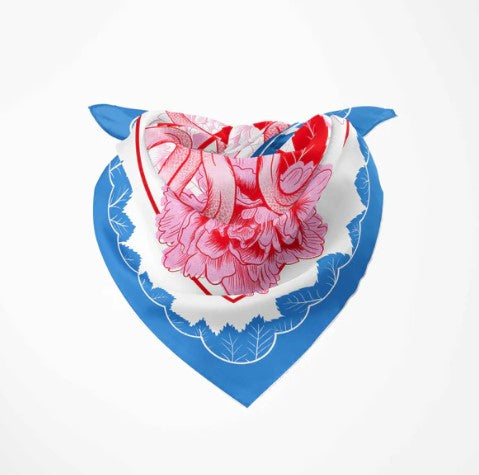 Featuring peonies and snakes. Artist-designed 100% silk scarf.