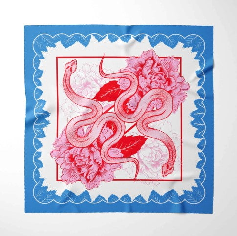 Featuring peonies and snakes. Artist-designed 100% silk scarf.